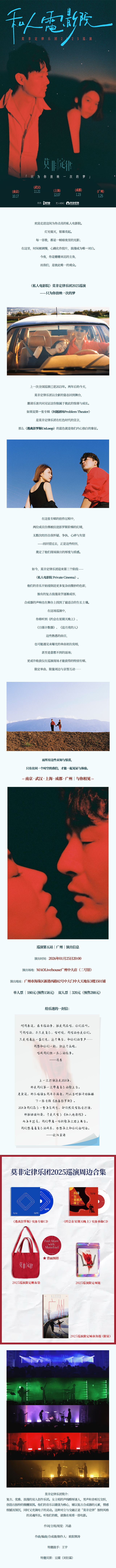 演出名称:【广州】《私人电影院》莫非定律乐团2025巡演广州站【网上订票】演出时间:2026.01.25 周日 20:00