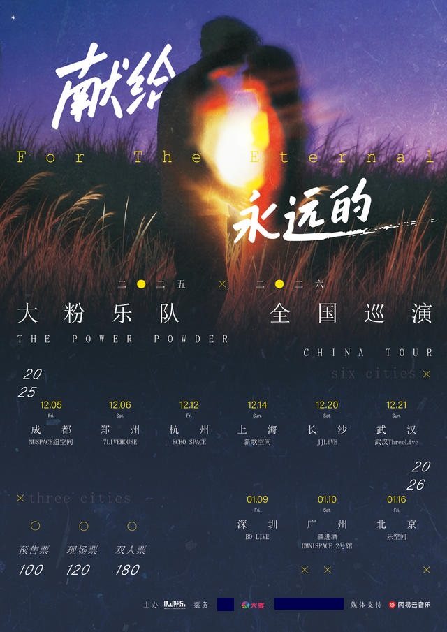 2025年,大粉乐队将以「献给永远的」为主题,再次启程。这场巡演,将以他们最为动人的同名作品为线索,用忧伤而柔和的情绪层层渗透,如同一个无限长的慢镜头,载着所有关于青春、记忆与爱情的碎片,驶向九座城市的夜晚。