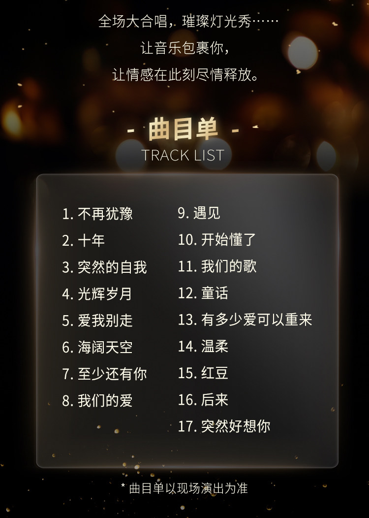 演出名称:【深圳】「突然好想你」我们的【歌】经典流行金曲live新年演唱会-沙井站【网上订票】演出时间:2026.01.24 周六 19:00