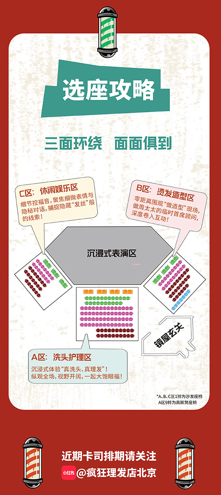 2.A区、B区、C区一排均为沙发座椅。