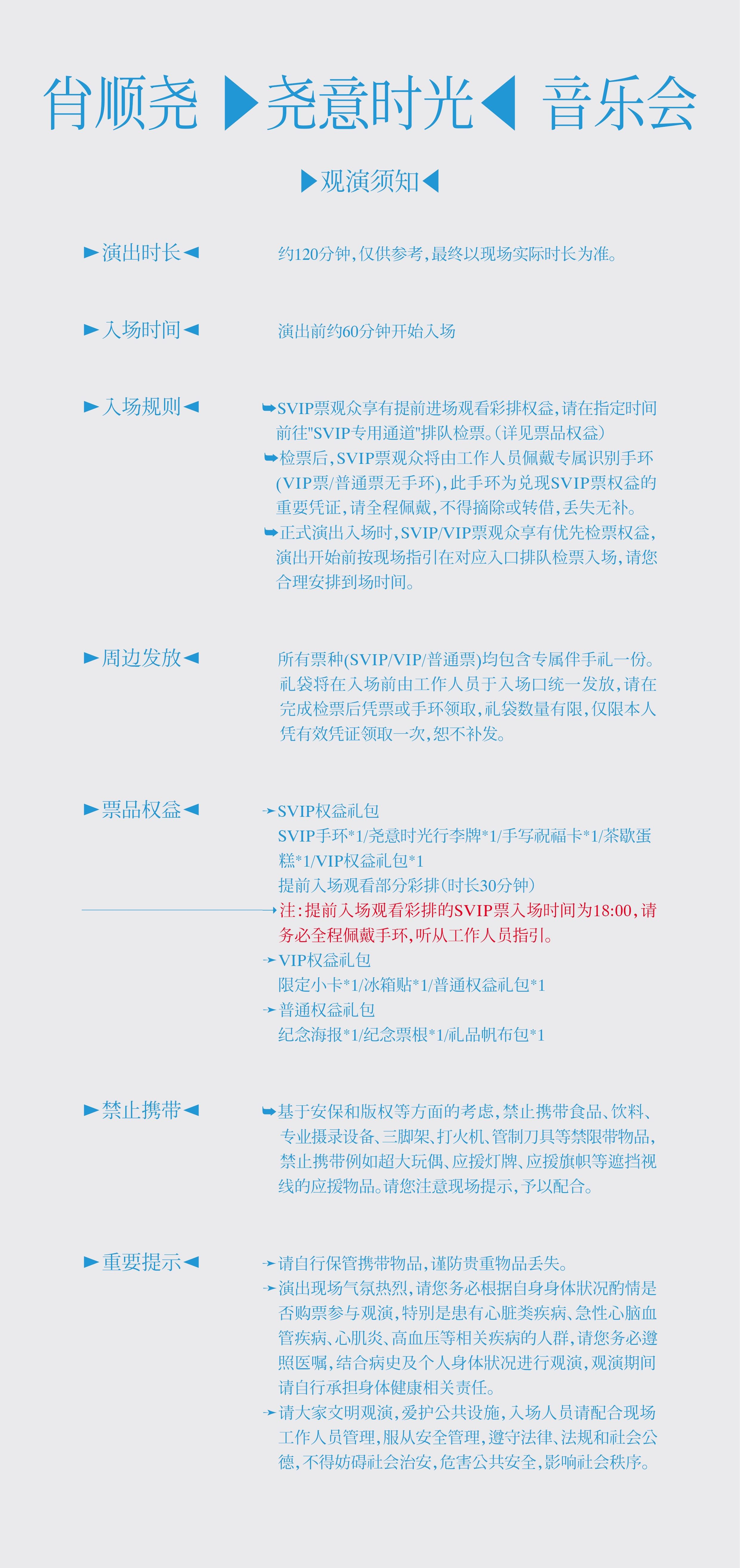 门票分为:快递纸质票、现场取票、电子票 (下单时请正常填写姓名、电话及收货地址,购买临近演出三天内场次,客服会在付款成功后联系您告知取票方式,当天演出请联系客服是否能即时出票,避免跑空;