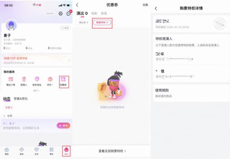 (2)登录后,点击“我的”,点击“优惠券”,点击“购买特权”,点击“购买特权详情”,此时您可查询到“北京国安2026赛季普通年票原座位续购”项目中您可购买的观演人;