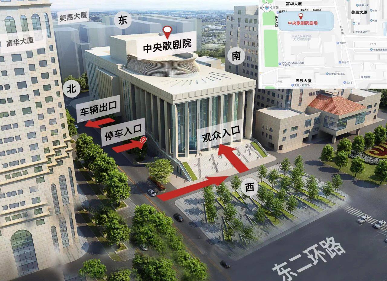 2.若自驾前往,可导航至中央歌剧院剧场停车场(入口),(地下停车场B1—B4均可停车),观众乘坐剧场北侧、南侧电梯至剧场一层,检票入场。