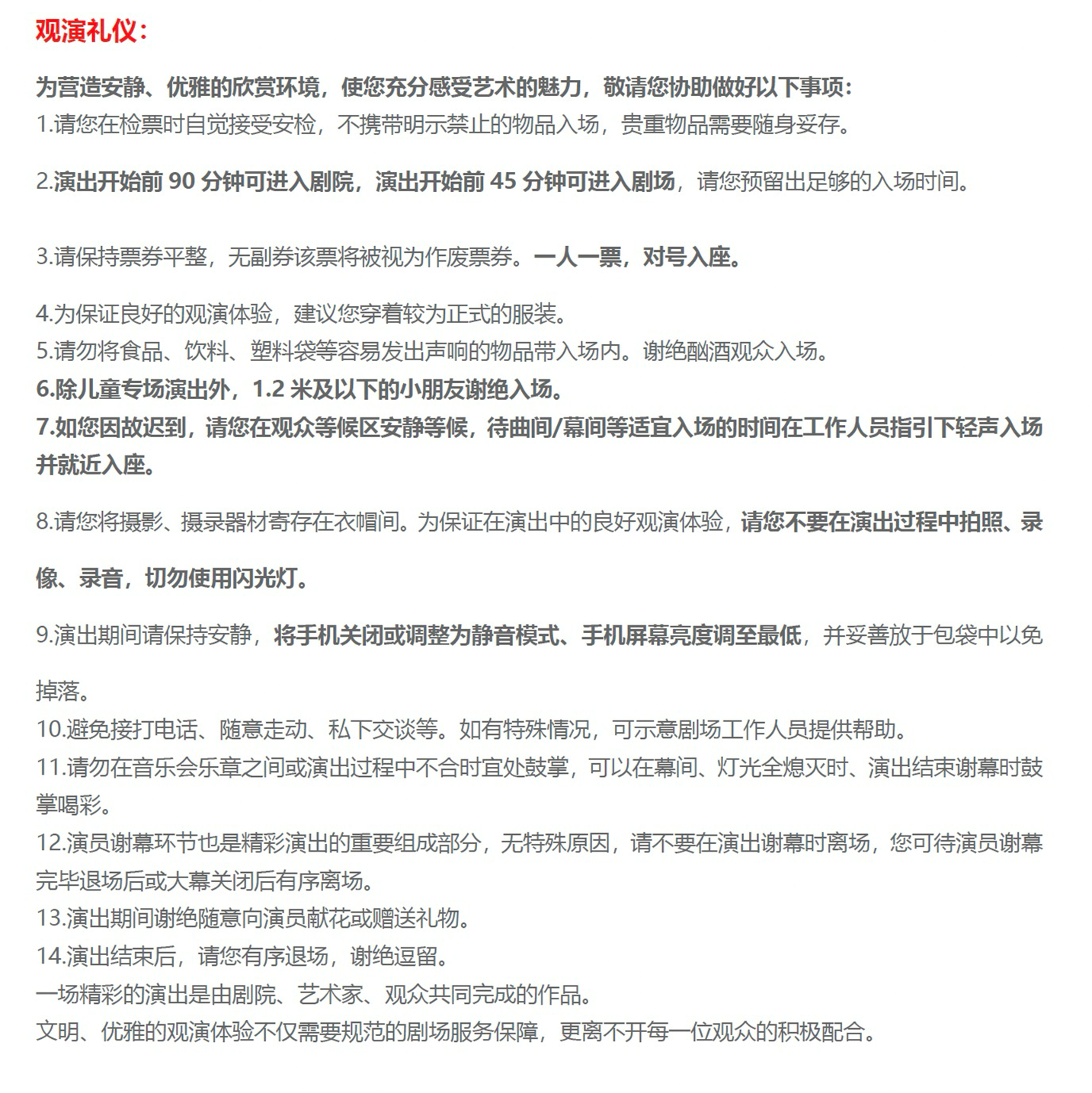 1.购买前请您提前规划好行程,做好相应准备,以免影响您的正常观演,感谢您的理解和配合。