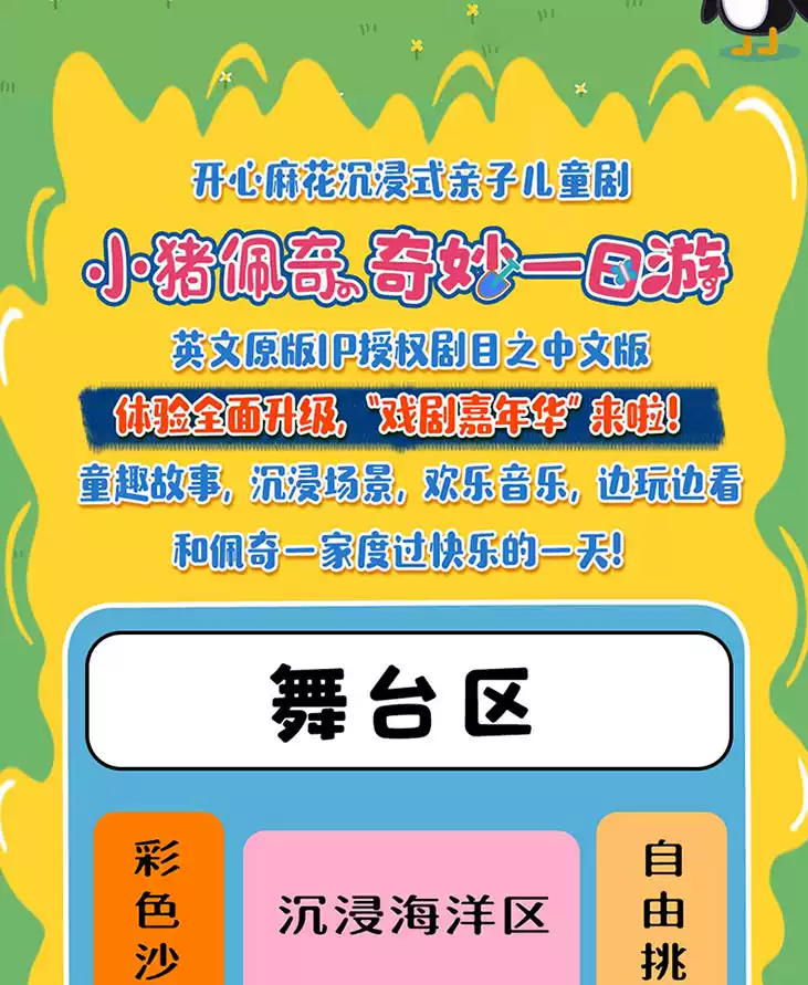 1.本演出坐席间通道也为舞台表演区域,小猪佩奇和朋友们将行走在您的身边,请注意小朋友游玩安全。